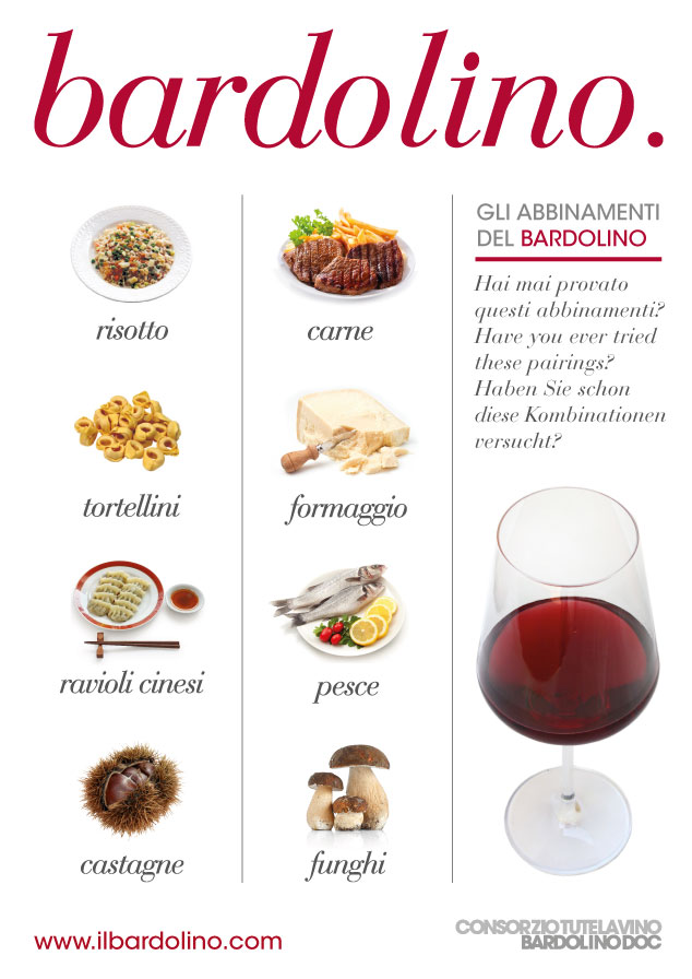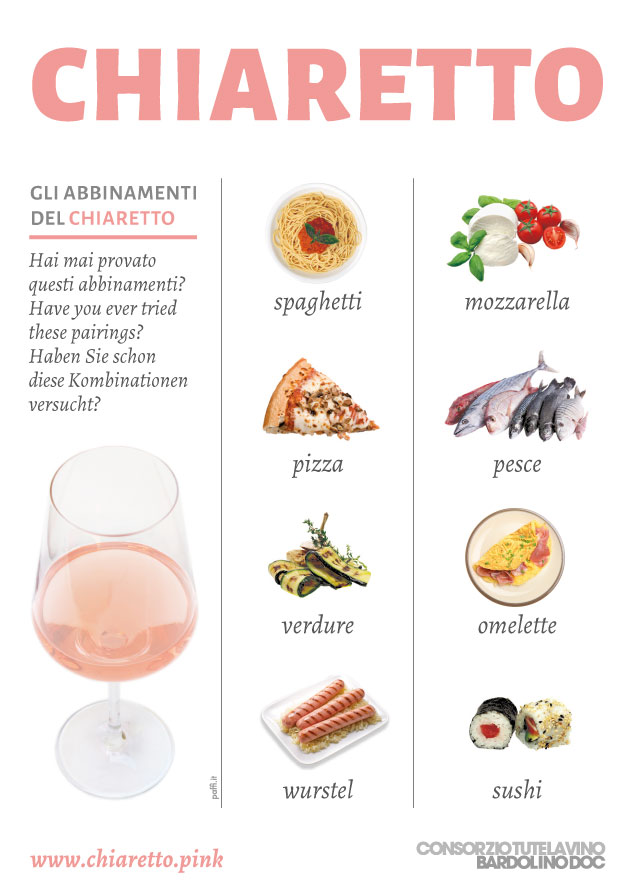 Il Chiaretto di Bardolino è un rosé perfetto come aperitivo o come pre-dinner informale, con la bottiglia nel secchiello del ghiaccio. In tavola, accompagna gli antipasti di salumi (sta alla perfezione con il prosciutto crudo), di pesce o anche di verdure (anche con un’insalata estiva condita con olio e un po’ di aceto balsamico).