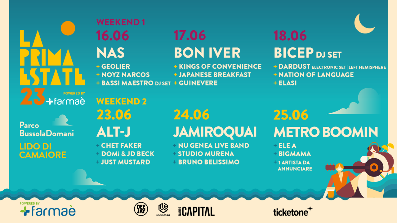 Il festival la prima estate si terrà nei due weekend 16-18 Giugno e 23-25 Giugno e avrà una line-up di eccellenza con nomi del calibro di Jamiroquai, Alt-J, Bon Iver, Metro Boomin e Bicep.