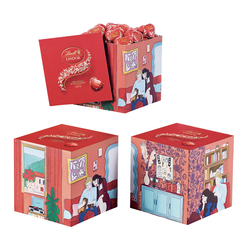Lindt sa che l’amore è difficile da descrivere a parole e ha quindi pensato ad una limited edition che possa raccontare una meravigliosa storia d’amore, fatta di dolci attenzioni e piccoli momenti quotidiani che sciolgono il cuore, proprio come Lindor. Le bellissime illustrazioni portano la firma di Carlotta Sangaletti, alias Charlotte Le Bleu, una giovane illustratrice e pittrice italiana che sta conquistando il web con la delicatezza dei suoi disegni.