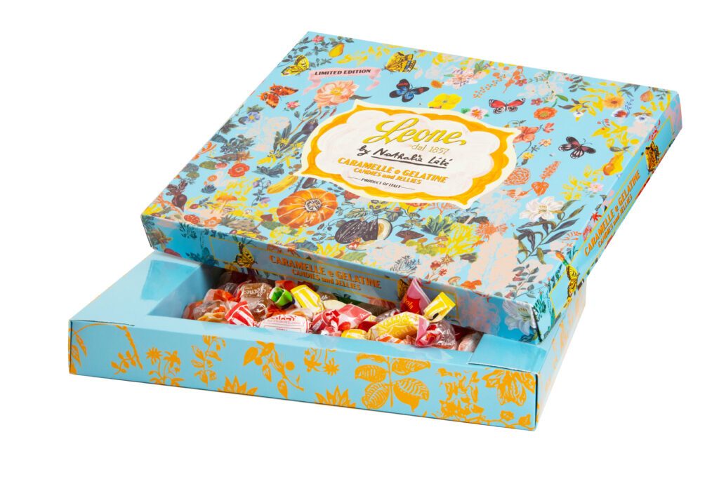 La firma distintiva di Leone si riflette anche nel packaging, in cui lo stile inconfondibile dell’azienda dolciaria si fonde ancora una volta con l’universo poetico di Nathalie Lété per dar vita a uno straordinario pezzo unico da collezione: una box illustrata con fiori, piante, farfalle e impreziosita con dettagli in oro lamina.