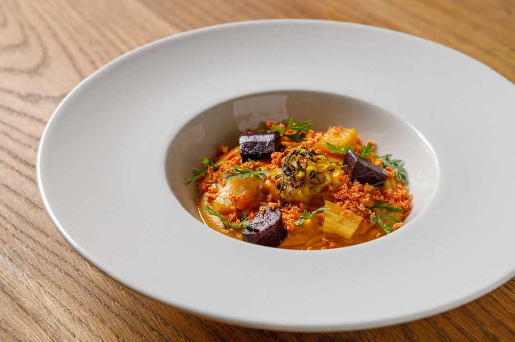Tra gli antipasti spicca anche Squid Game, il rinvio del nome è alla popolare serie Tv. In questo caso il modulo portante è nel “gioco di confusione” molto caro allo Chef, che inanella letteralmente la rapa bianca, il daikon e il calamaro, accostati al gel al rafano, per creare una presentazione in bianco, completata al tavolo dal brodo di calamaro e “sporcata” dal nero di seppia.