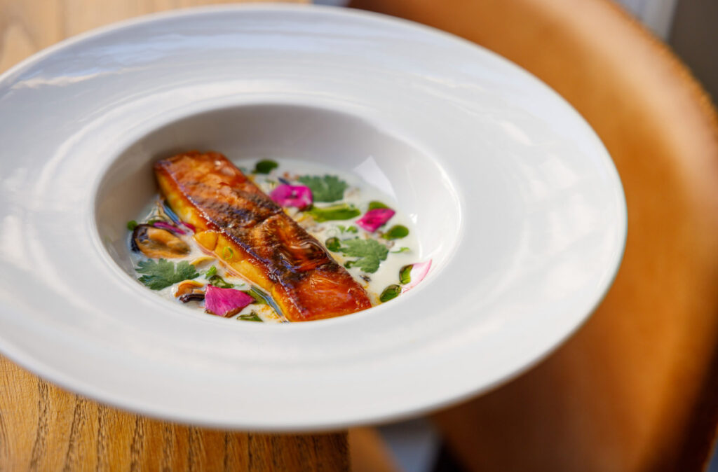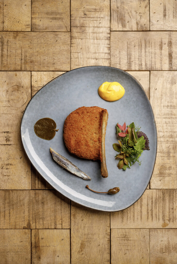 Tra i secondi iconici dello Chef, grande ritorno di Questa una Cotoletta? E’ una battuta? La “classica” costoletta di vitellone dalla croccante panatura artigianale, servita con l’osso, che sorprende per il cuore crudo: una tartare al profumo di colatura d’alici di Cetara.