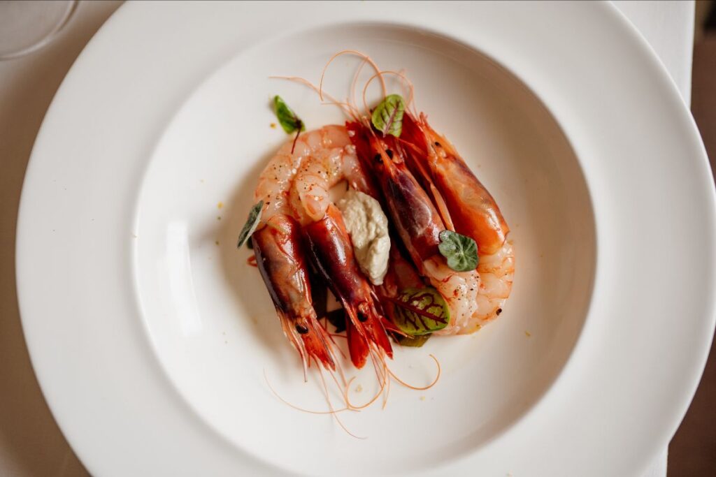 Di recente introduzione, in carta solo dal 2019, i gamberi al gin sono uno degli antipasti più richiesti dagli ospiti del Don Camillo e quello che forse più rappresenta il trait d’union tra lo chef Guarneri e il suo territorio. Qui la materia prima è protagonista e non è un caso che lo chef abbia scelto di utilizzare il Gambero viola di Capo Passero che, oltre a essere pescato nelle acque siracusane, si caratterizza per una carne particolarmente soda e una testa molto succulenta. In mancanza del prodotto, mantenendo l’identità territoriale, il piatto viene realizzato con il Gambero rosso di Ortigia.