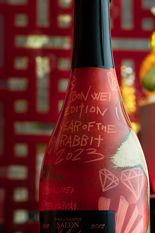 L’artista che ha risposto all’appello è Teo Kaykay, street artist pioniere nella customizzazione dello champagne che per Bon Wei ha dipinto due esemplari (rispettivamente un Salon Blanc de Blancs Le Mesnil – Brut 2012, e un Cristal Rosé 2009 Louis Roderer) con il simbolo del coniglio (una sagoma oro su sfondo rosso, colore simbolo del Capodanno Cinese, di Bon Wei e allo stesso tempo del coniglio), il suo ideogramma e il caratteristico diamante, tag con cui firma le opere.