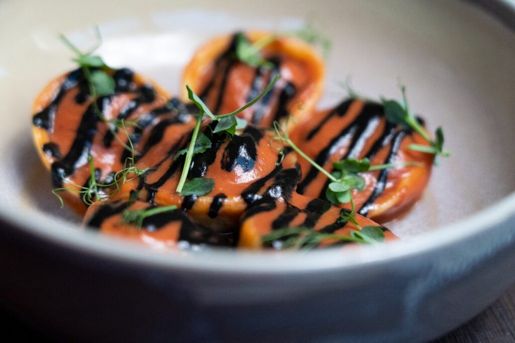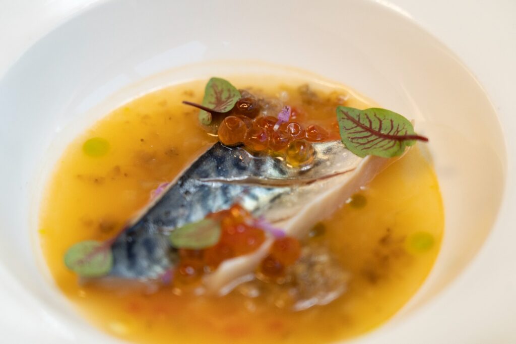 Sgombro marinato, acqua di pomodoro alla brace, uovo di salmone e melanzana.