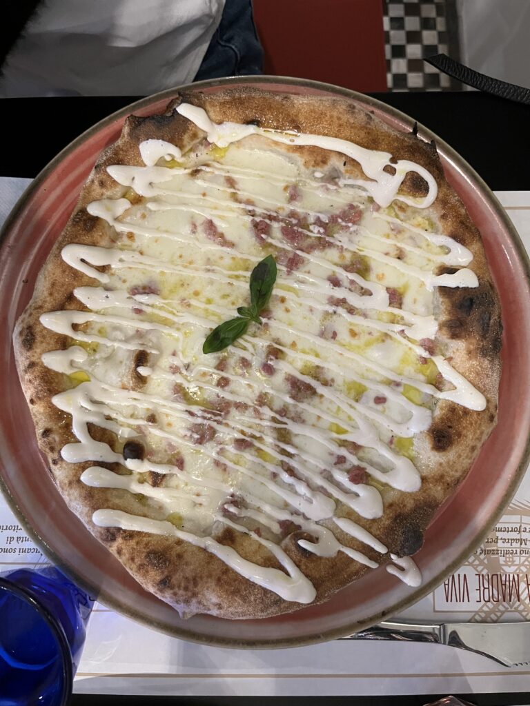 La Pizza Fandango, invece, è fatta con fior di latte, salsiccia fresca sbriciolata, rucola (che abbiamo tolto per nostro gusto) fonduta di parmigiano reggiano. Abbiamo trovato un impasto leggermente più morbido, probabilmente dovuto alla tipologia di ingredienti, ma al tempo stesso la pizza all’assaggio era molto più “importante” e decisa nei sapori che, a nostro avviso, ci hanno ricordato il territorio lucano.