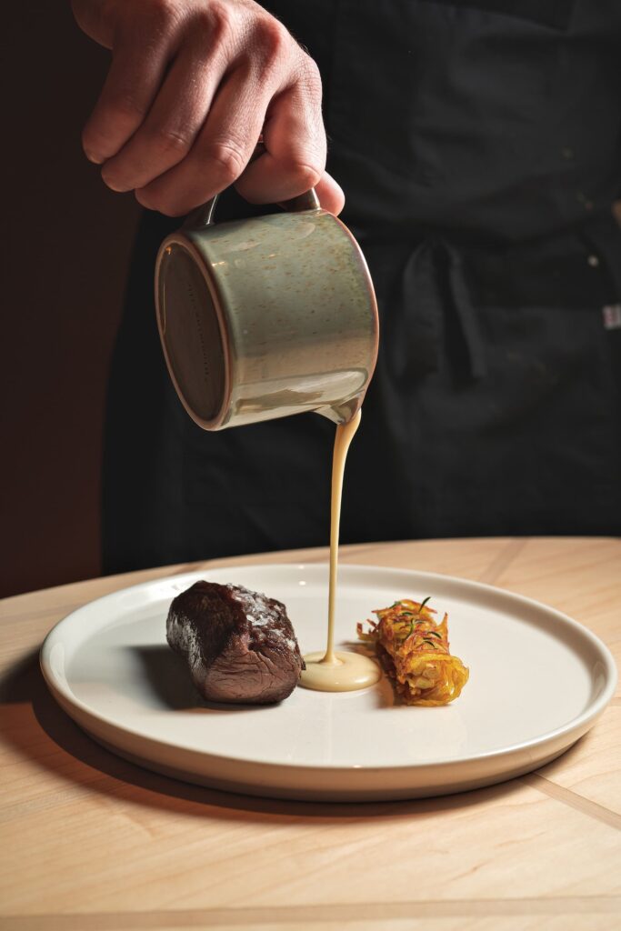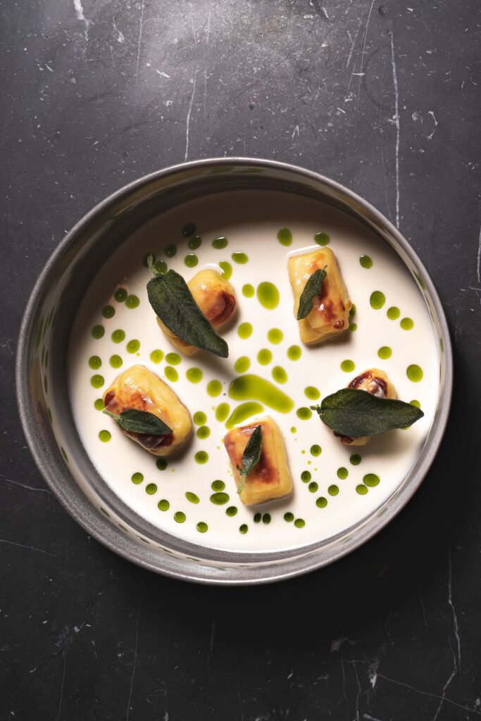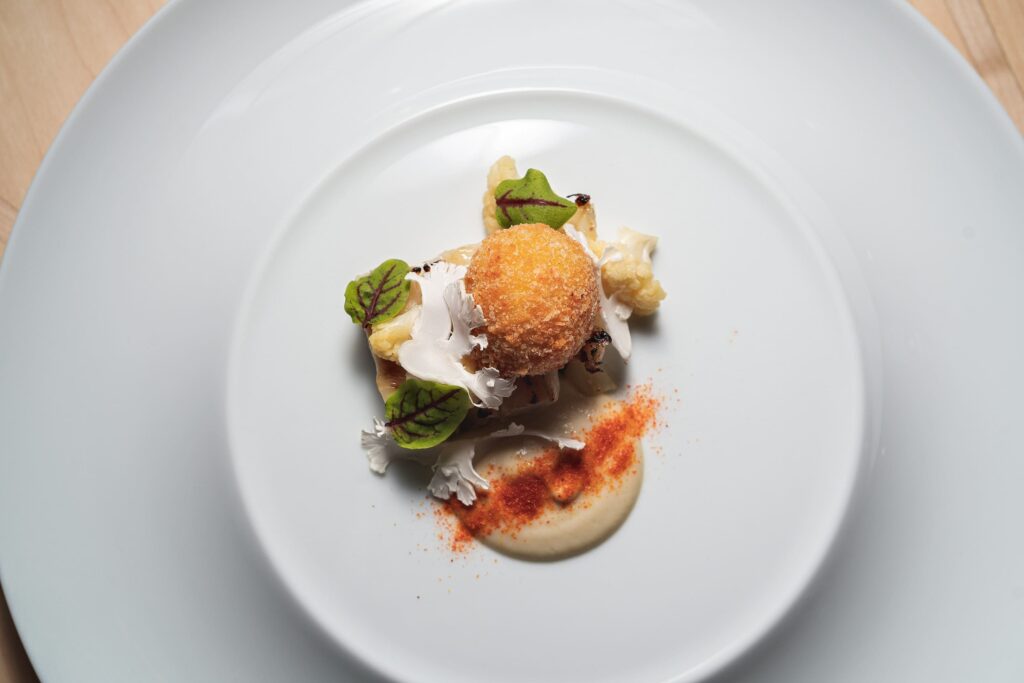 Il menu propone l’idea di cucina contemporanea italiana del giovane e talentuoso chef campano Michele Cioffi (classe 1993, con dieci di esperienza in giro per il mondo – Gillray’s Steakhouse & Bar e Berners Tavern a Londra, JW Marriot Resort & Spa e l’Hotel Bauer a Venezia, il ristorante Splendido del Ritz-Carlton a Dubai). Piatti gustosi, realizzati con prodotti italiani a Km zero d’eccellenza e qualche sfizio d’Oltralpe, ispirati alla tradizione ma con quel tocco di creatività che si traduce in una gioia per gli occhi e per il palato.