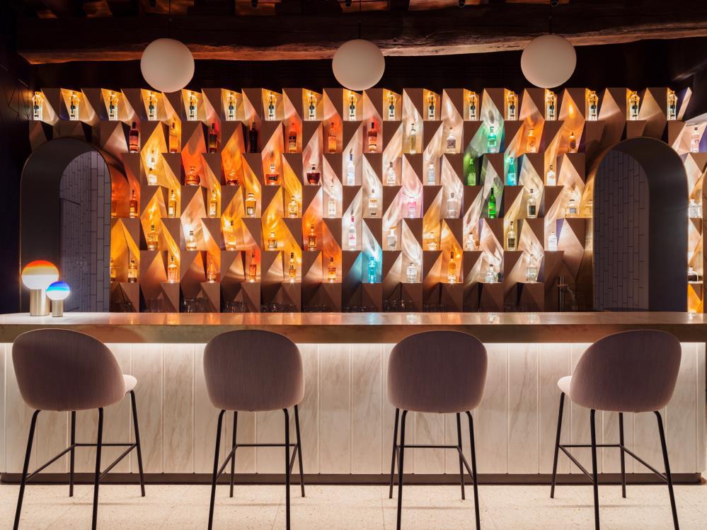Entrando nel locale gli ospiti accedono alla zona bar e bistrò dove gli dà il benvenuto la bottigliera, un originale sistema di mensole tridimensionale per i liquori in acero americano, la quale prende ispirazione dai porta candele dell’adiacente cattedrale. Ognuna delle bottiglie poggia su una mensola dedicata ed e’ illuminata da sotto, facendola sembrare una candela. Alla sera la luce soffusa emanata dalle bottiglie crea un elegante ed intimo effetto di luce, invitando i sensi a rilassarsi ed immergersi nell’atmosfera del locale.