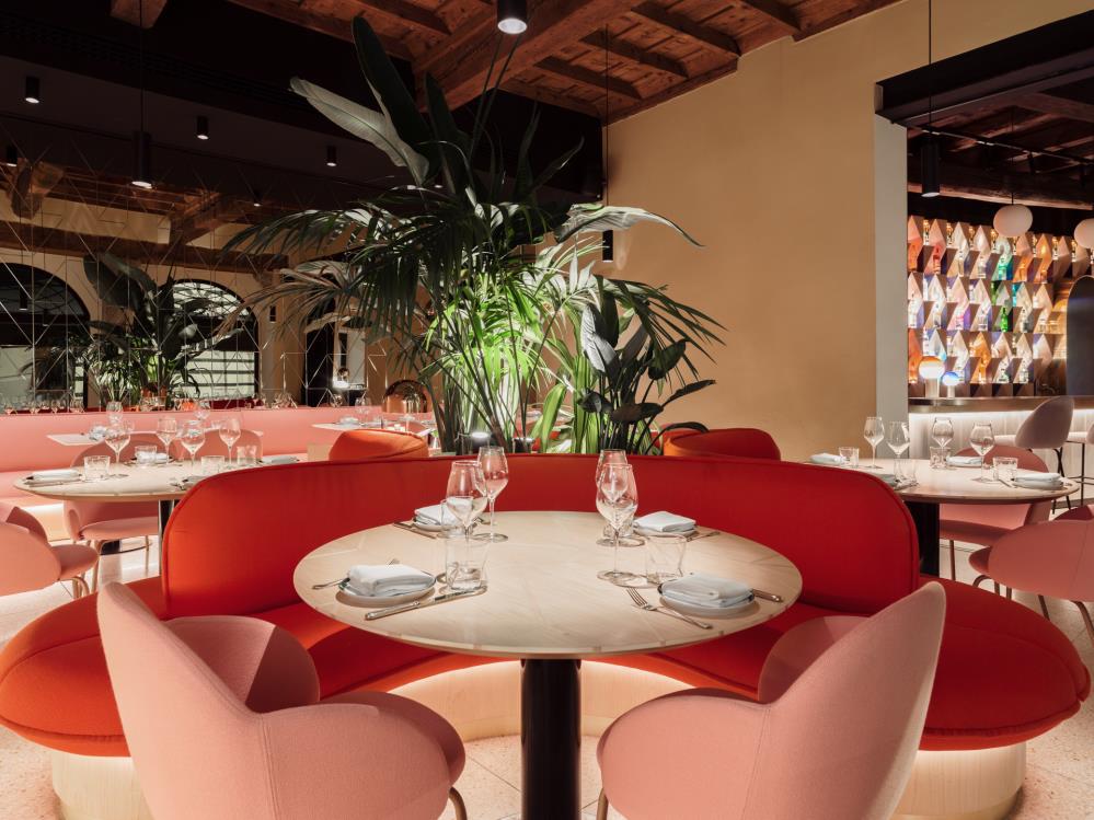 Continuando nel locale si trova la stanza della zona pranzo e cena (Dining area), una area più formale ma allo stesso tempo gioiosa. Nel centro della stessa si trova il ‘Fiore’ un divano arancio che serve 4 tavoli; ognuna delle 4 aree del divano crea una sensazione di intimità ma allo stesso tempo resta in connessione con il resto della sala. Al centro del divano c’è uno spazio dedicato ad installazioni temporanee, quella di apertura del locale era dedicata alla Natura ed è formata da piante alte e medio-alte, le quali ci ricordano la bellezza e l’importanza della Natura per il nostro benessere. Tutte le altre sedute nella zona dining sono rosa, le quali danno un tocco di gentilezza e freschezza alla stanza. La parete sul retro e parallela alla facciata è decorata con uno specchio bronzato ed intarsiato a tutta parete, il quale riflettendo la vita sulla piazza, la porta all’interno del locale.