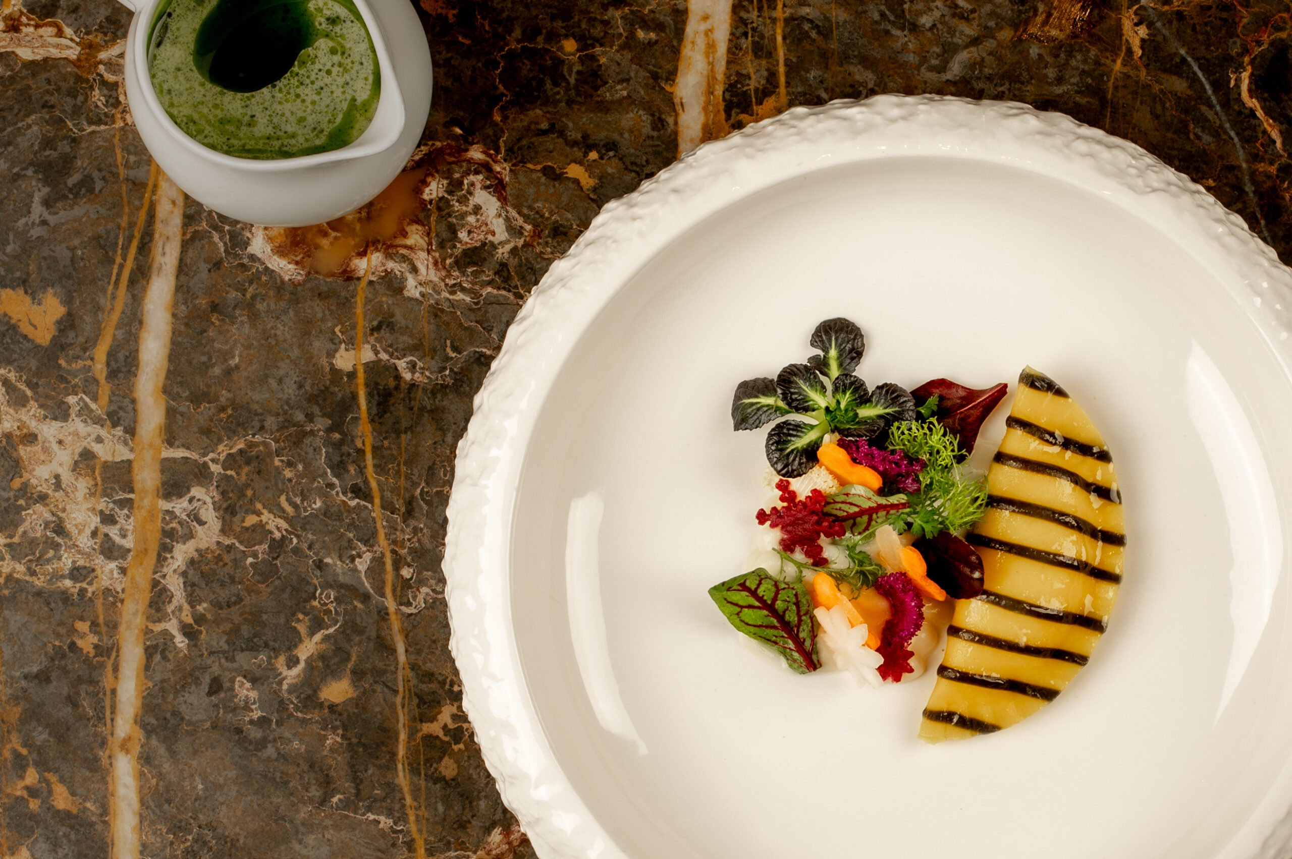 Il secondo menù è Botanic World, cinque portate completamente vegetariane caratterizzate da preparazioni attente e abbinamenti vegetali inaspettati, come kale e mango acerbo, patata e cocco, primo fiore e Kombucha.