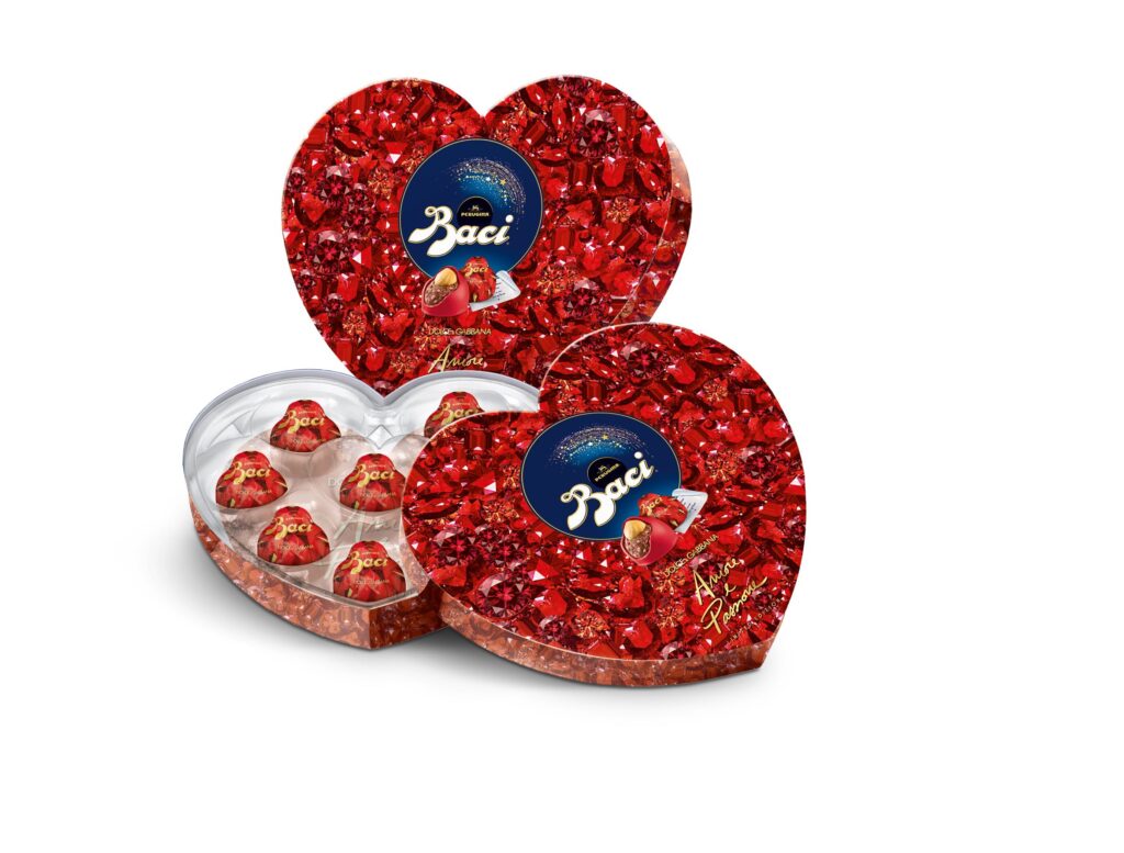 Dolce&Gabbana ha firmato l’edizione limitata dedicata all’Amore e alla Passione, tempestando le confezioni di Baci di gemme e pietre preziose di un rosso intenso e brillante. Anche l’incarto in alluminio di ogni singolo cioccolatino scintilla di rosso, in perfetta armonia con le scritte color oro.