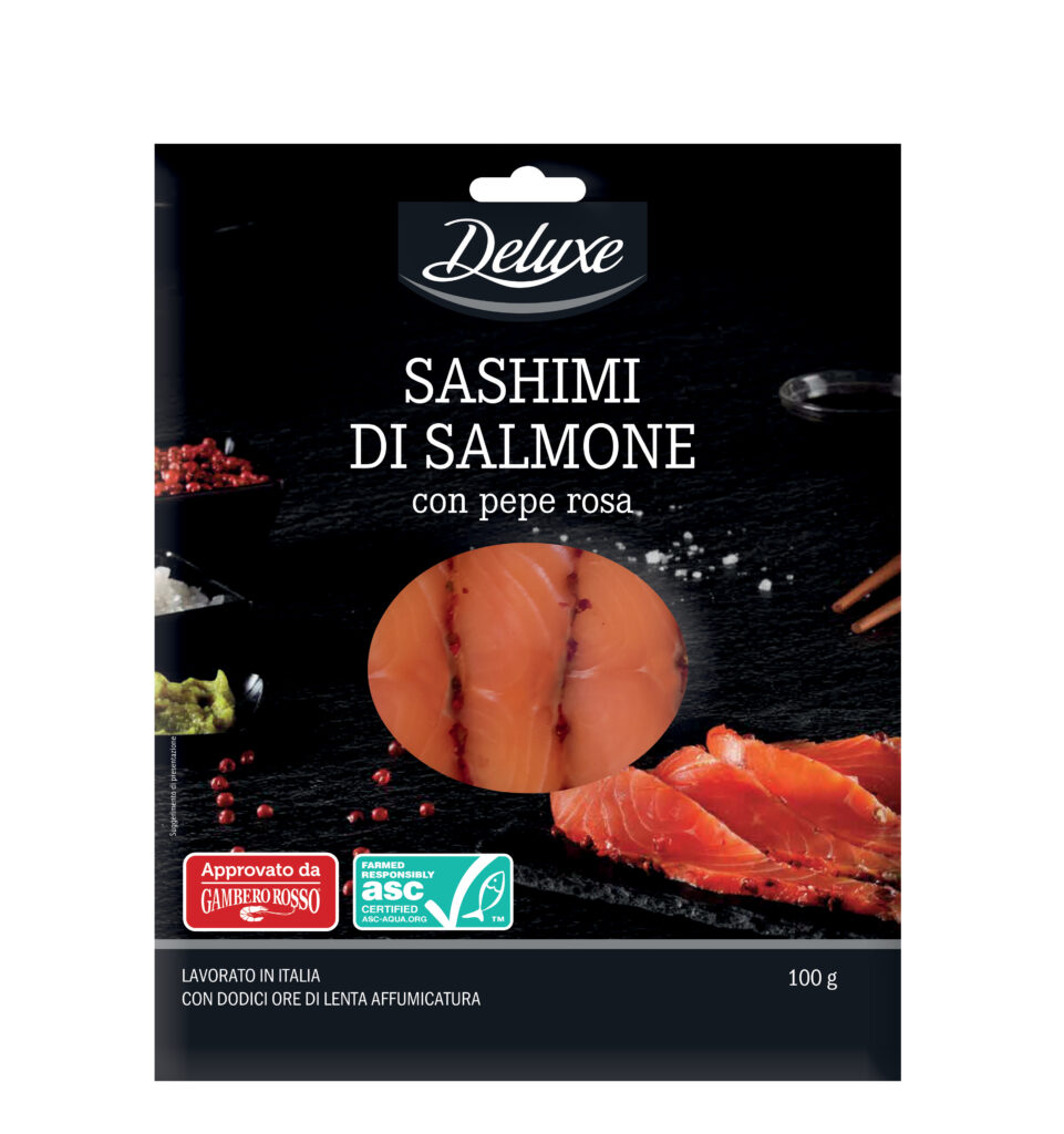 Il sashimi firmato Deluxe è un morbido trancio di salmone già tagliato in fettine, secondo la tecnica tradizionale giapponese. Al profumo di pepe rosa, da servire con salsa di soia a parte, per dare un tocco etnico al pranzo di Pasqua!