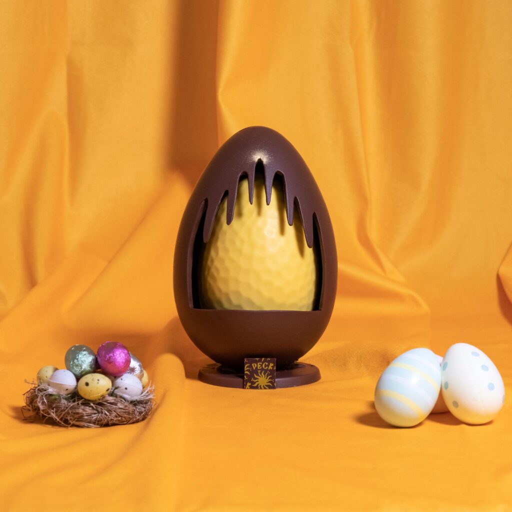 Per la Pasqua 2023, Peck omaggia Milano con l’Uovo alla Milanese: una pregiata creazione di cioccolato, realizzata artigianalmente dai maestri pasticceri nei laboratori di Spadari. Un uovo giallo di cioccolato bianco, cosparso internamente di riso soffiato, zafferano e sale Maldon, è racchiuso in un guscio di cioccolato fondente tagliato a mano, che ricrea la sagoma del Duomo con una puntina d’oro sulla sommità per evocare la Madonnina, simbolo del capoluogo lombardo.