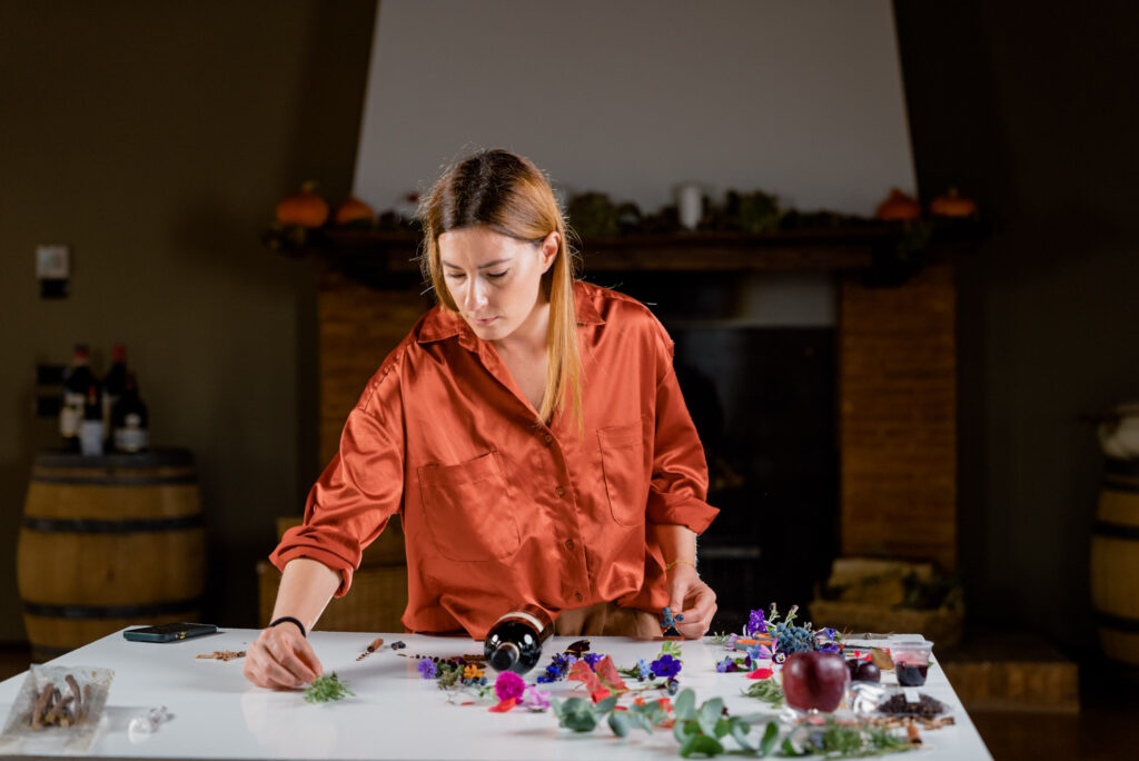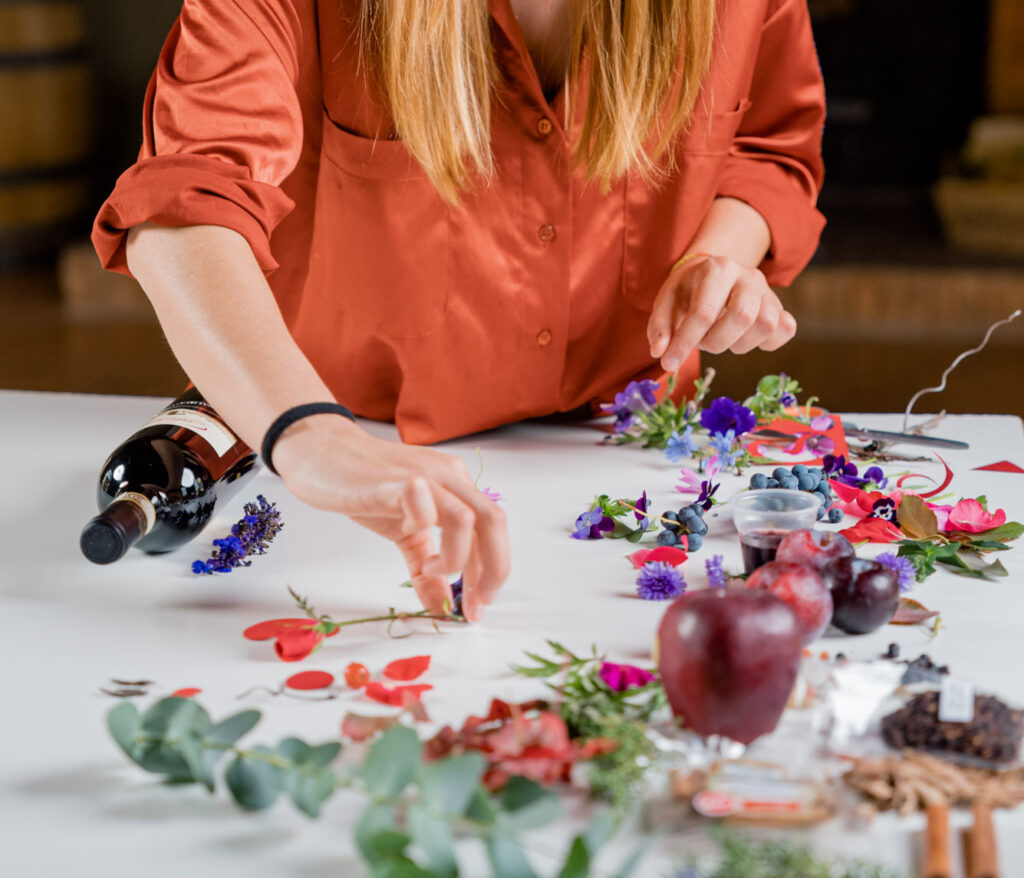 La sua arte nasce sempre da elementi naturali o alimentari, e tutti i suoi lavori – come dicevamo – sono «effimeri, scompaiono dopo la realizzazione». «Queste caratteristiche ci sono sembrate perfette per cercare di rappresentare in modo visivo e artistico il nostro Sagrantino e la sua personalità piena di sfaccettature: anche il vino è natura, è alimento ed è, a tutti gli effetti, effimero, perché il suo scopo è quello di essere consumato. In ultimo, ma non per ultimo, anche il vino è arte, e da sempre la nostra cantina è legata a questo mondo, in primis con il progetto Caprai4Love», spiega Marco Caprai.